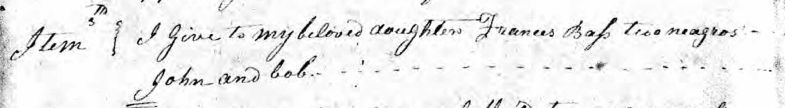 In 1822, my ole Masser died. His name was Jesse Bass. I don’t remember him very well because I was so young, maybe about 3 years old. He wrote a will before he died, and he gave me and my brother John to his youngest daughter, Miss Fanny Jane.
