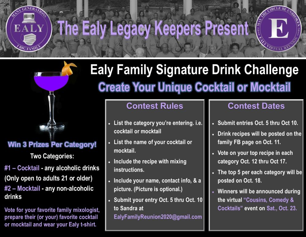 ENTER THE EALY SIGNATURE DRINK CHALLENGE! See flyer and details below. If you have any questions, contact Sandra Richardson at EalyFamilyReunion2020@gmail.com.