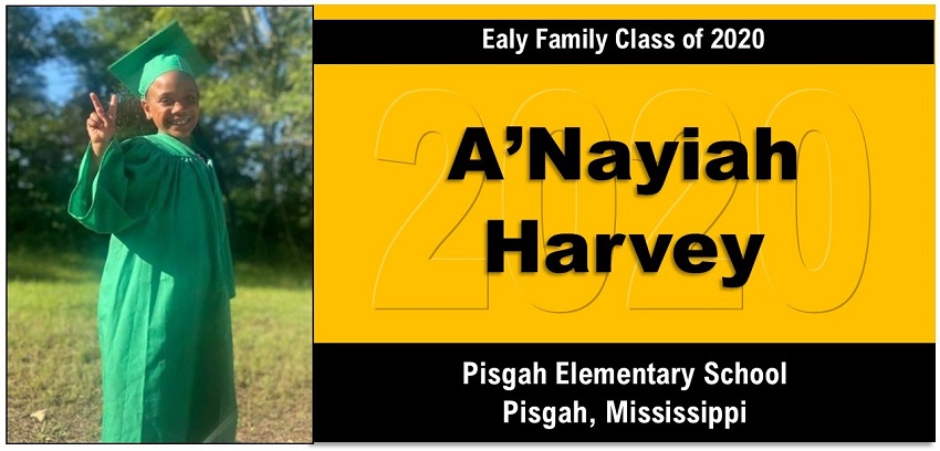 A’Nayiah Harvey graduated from Pisgah Elementary in Pisgah, Mississippi, from kindergarten to first grade. She is the daughter of La Chaz Irvin, the granddaughter of Patricia Youngblood, the great-granddaughter of Charlie Youngblood, and the great-great-granddaughter of Mattie Ealy Waits. (Robert Ealy, Jr. Branch & Adeline Ealy Robertson Branch)
