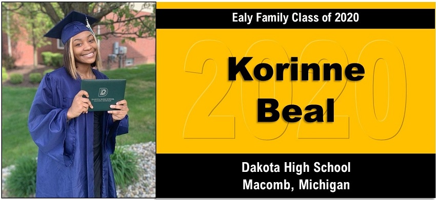 Korinne Germane Beal graduated from Dakota High School in Macomb, Michigan. She plans to attend Paul Mitchell School of Beauty in the fall. Korinne is the daughter of Erika Ealy Beal, the granddaughter of Robert Louis Ealy, Sr., the great-granddaughter of Littion Pete Ealy, and the great-great-granddaughter of Joe Howard Ealy. (Augustus “Gus” Ealy Branch)